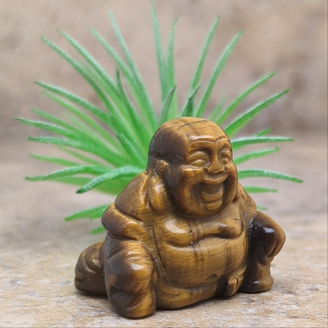 Tiger Eye Laughing Buddha~CRTELBD2. The Laughing Buddha emerged from Chinese folktales of the 10th century. The original stories of the Laughing Buddha centered on a Ch'an monk named Ch'i-t'zu, or Qieci, from Fenghua, in what is now the province of Zhejiang. Ch'i-t'zu was an eccentric but much-loved character who worked small wonders, such as predicting the weather. Chinese history assigned the date of 907-923 CE to Ch't'zu's life, which means he lived considerably later than the historical Shakyamuni, the true Buddha. One of the best feng shui locations for a Laughing Buddha is close to the front door so that you can see it as you come home. Laughing Buddha is considered to be a patron of children. Laughing Buddha is used in feng shui to bring good luck, abundance, happiness, success, good health; any feng shui bagua area can benefit from the sparkling energy of the Laughing Buddha.Tiger eye is a stone of the sun, and of the Solar Plexus Chakra. It is conducive to peacefulness. It is helpful for individuals seeking clarity and for those who must deal intelligently with the scattered details which must be brought together into some pattern. It can also provide insight into those issues which induce internal mental battles. It allows one to hold contradictory ideas in a non-judgmental acceptance, creating harmony between people and families operating with different viewpoints. It assists one in moving out of the world of duality, of right and wrong, good and bad, dark and light, and into a realm where all polarities are expressions of the single source. It allows for ones life, and ones passion for life to open and blossom. It has been used to stimulate wealth, and to enhance the stability required to maintain wealth. 31mm x 30mm x 21mm
