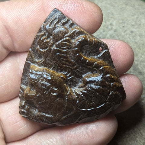 Tiger Eye "Tiger" Carving~CRCRV999. Tiger eye is a stone of the sun, and of the Solar Plexus Chakra. It is conducive to peacefulness. It is helpful for individuals seeking clarity and for those who must deal intelligently with the scattered details which must be brought together into some pattern. It can also provide insight into those issues which induce internal mental battles. It allows one to hold contradictory ideas in a non-judgmental acceptance, creating harmony between people and families operating with different viewpoints. It assists one in moving out of the world of duality, of right and wrong, good and bad, dark and light, and into a realm where all polarities are expressions of the single source. It allows for ones life, and ones passion for life to open and blossom. It has been used to stimulate wealth, and to enhance the stability required to maintain wealth. 52mm x 54mm x 13mm